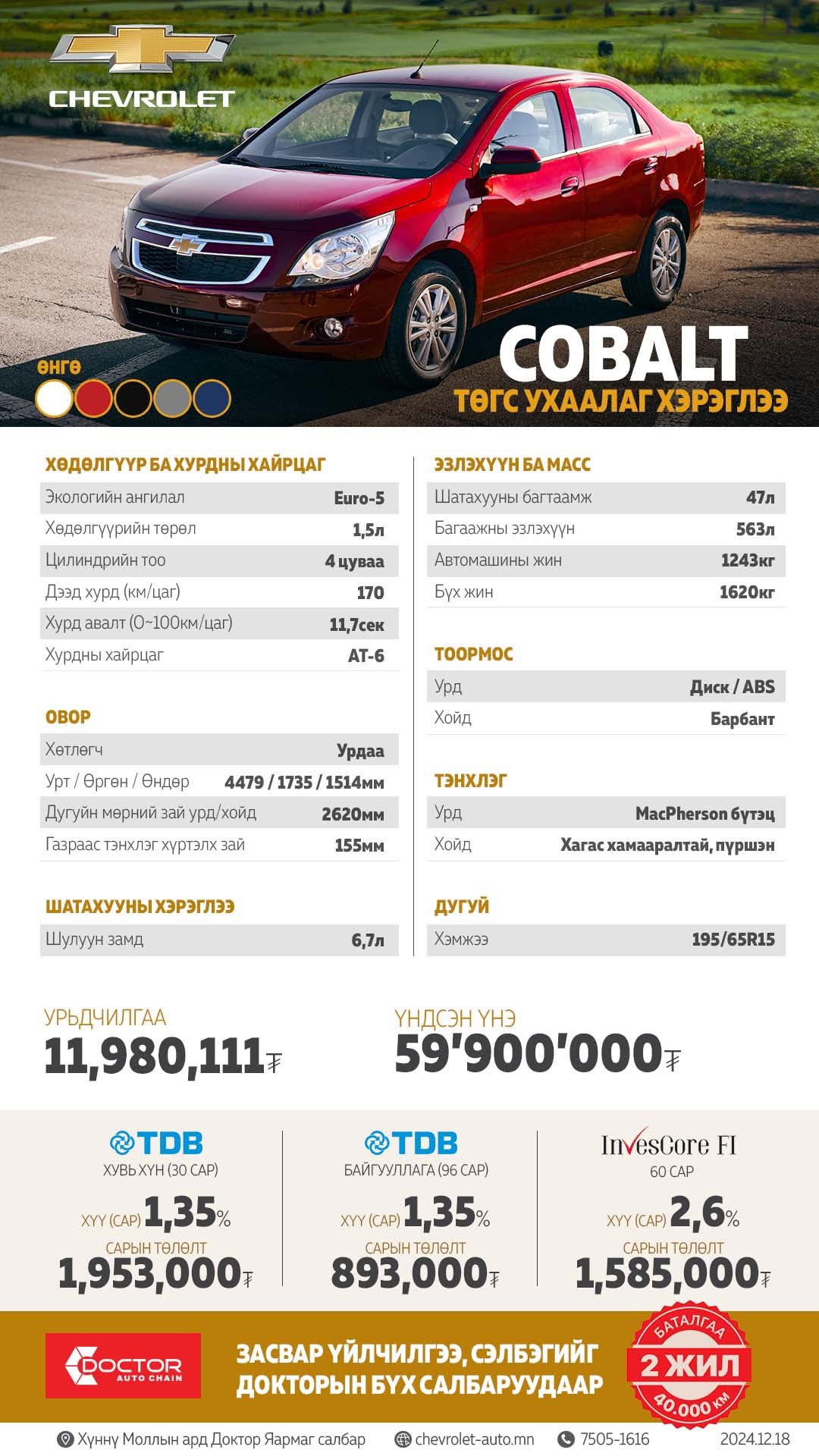 СHEVROLET COBALT бол тав тух, нарийн хийц, өндөр дэвшилтэт чанар болон мөнхийн уламжлалт сонгодог загваруудын хослол юм. Энэ бол сайтар бодож боловсруулсан загвар бөгөөд боломжийн үнэ, зай багтаамж, дэвшилтэт жолоодлогын гайхамшгийг өөртөө цогцлоосон шилдэг седан юм. Кузов дээр өндөрт өргөгдсөн хажуугийн товгор нь жавхаа, сүр хүчийг нэмж, чамин, дэгжин харагдуулдаг.